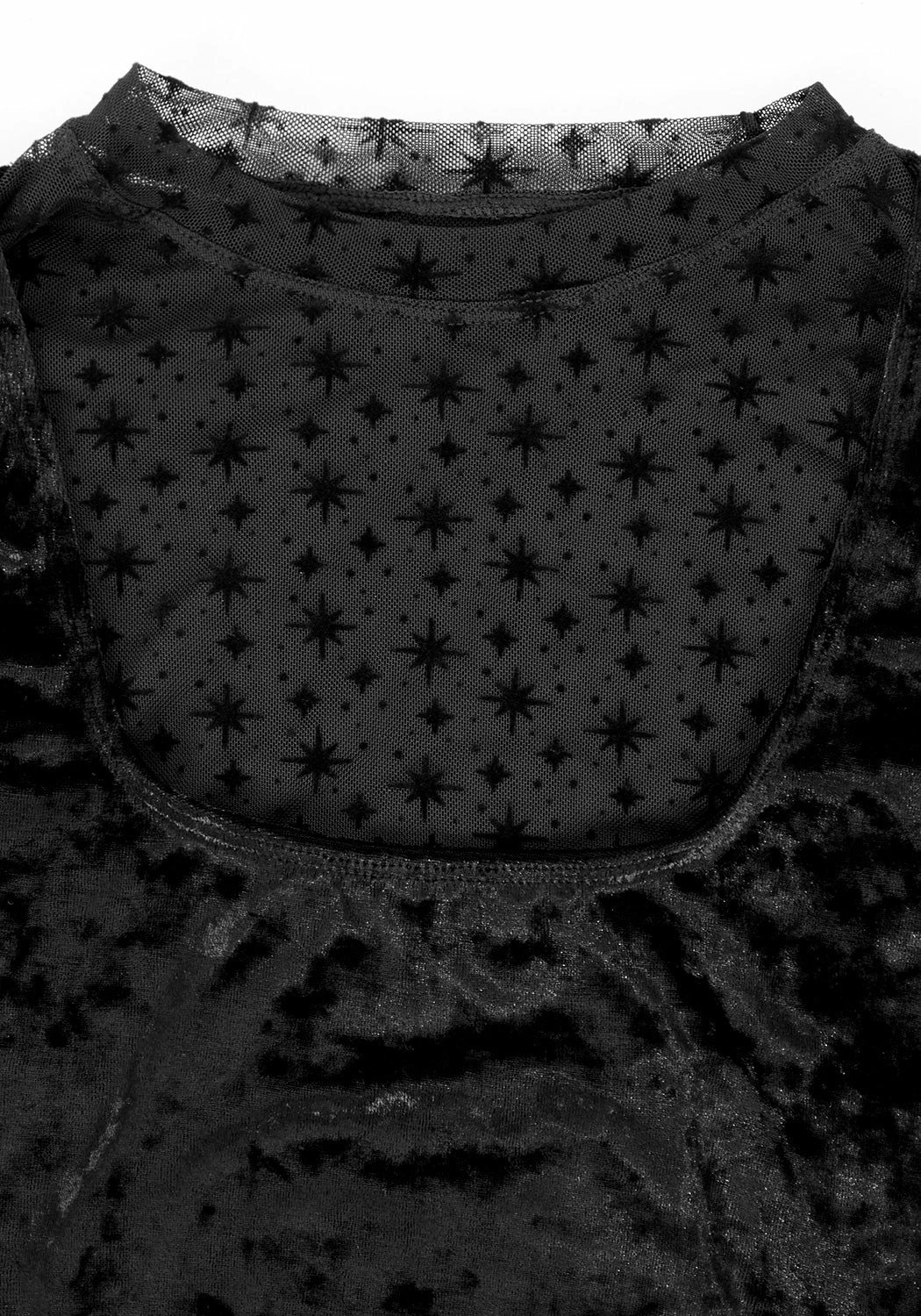 โถ Mesh top section has mock neck & long sleeves – attaches to dress by waist & side seams