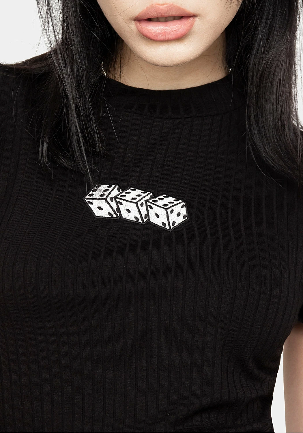 Chest embroidery shows three dice landing on sixes (see how long it takes people to notice)
