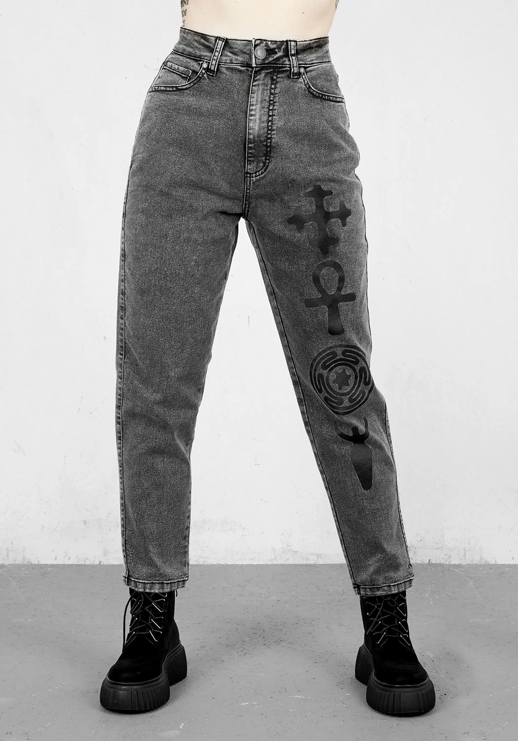 🕂 Washed grey-black denim printed mom jeans