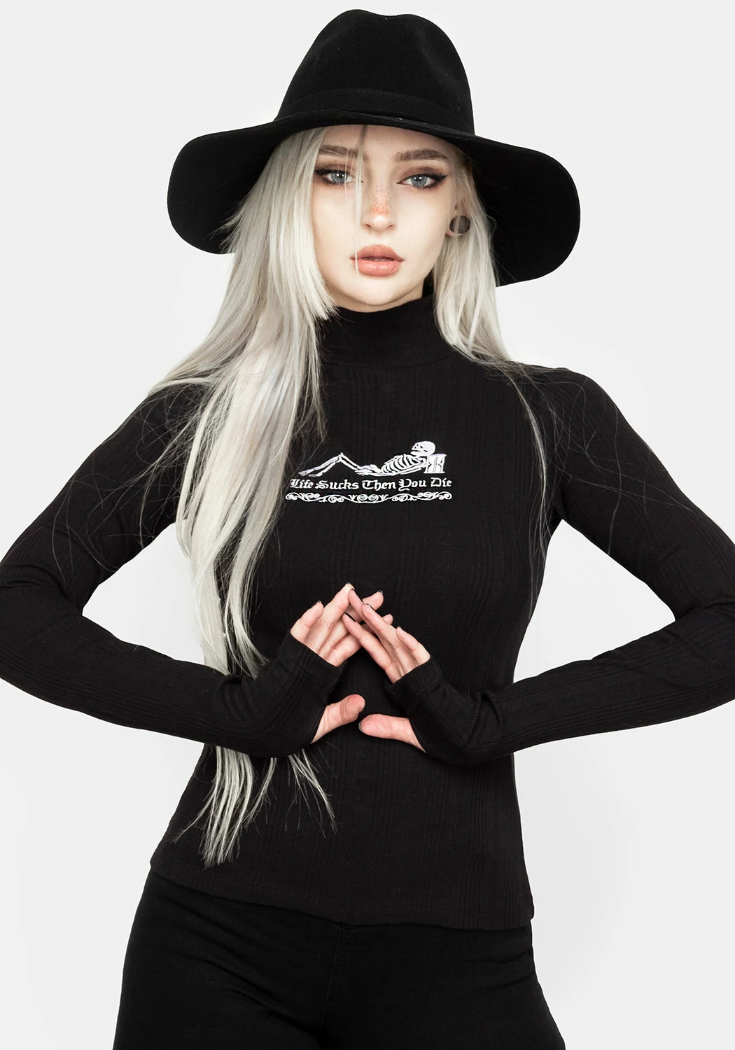 ✧ Front chest embroidery reads ‘Life Sucks Then You Die’ with skeleton design in white