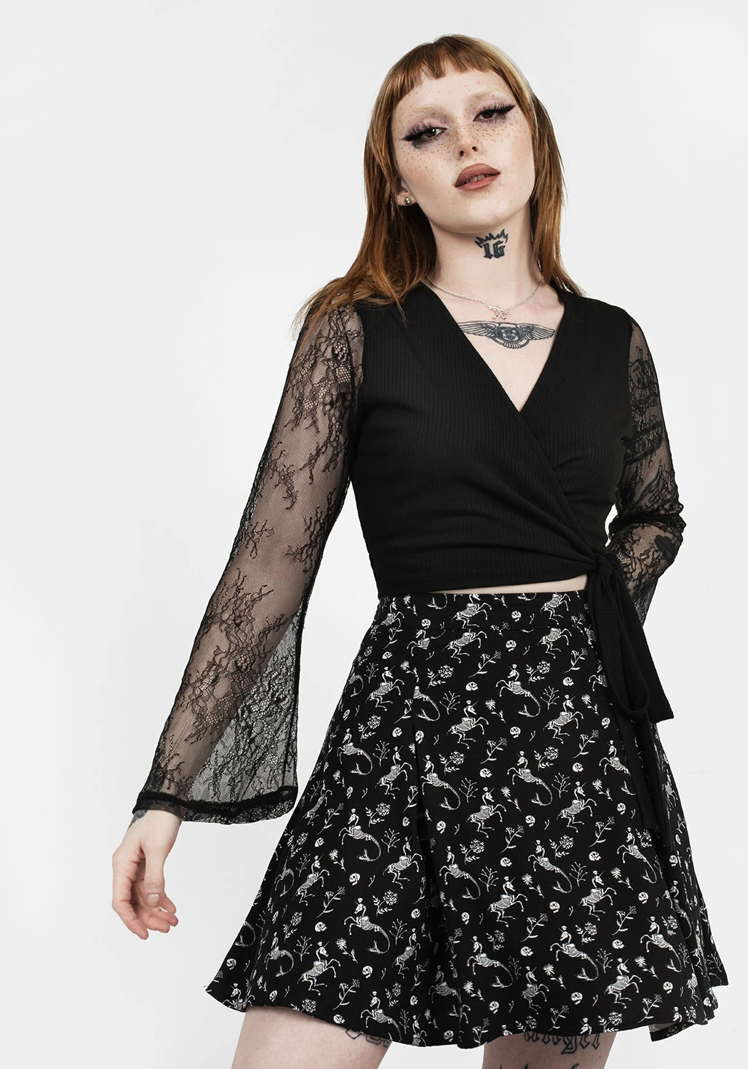 โฆ Cropped wrap top with flared lace sleevesย ย