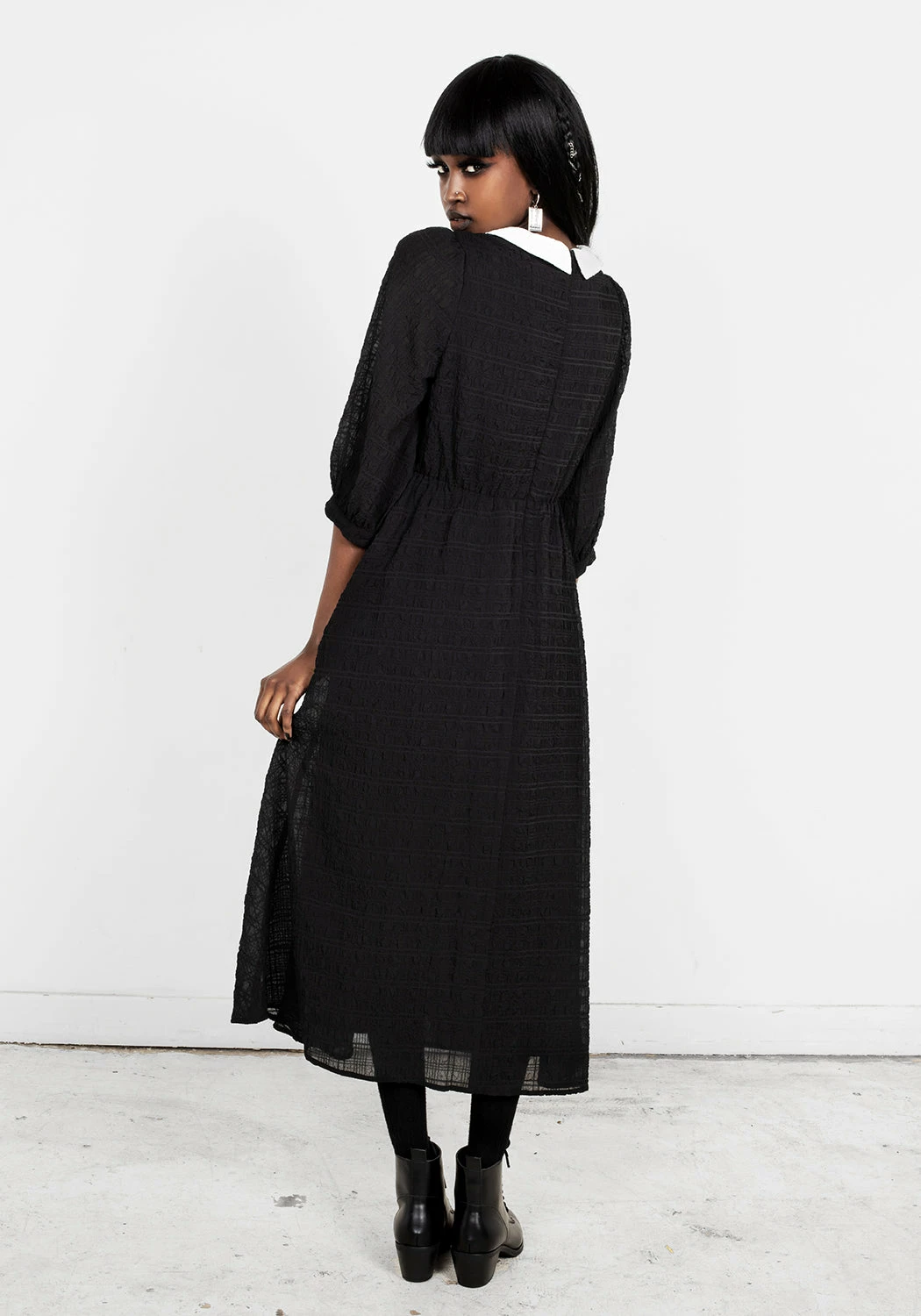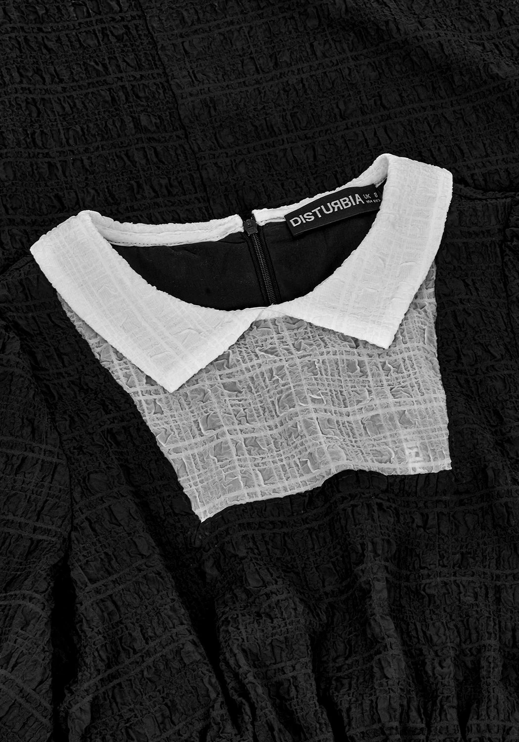 🟌 Black sheer textured fabric (slight stretch) with white collar & front yoke panel