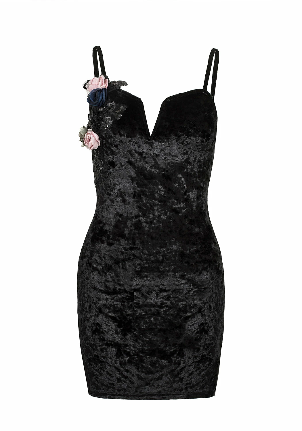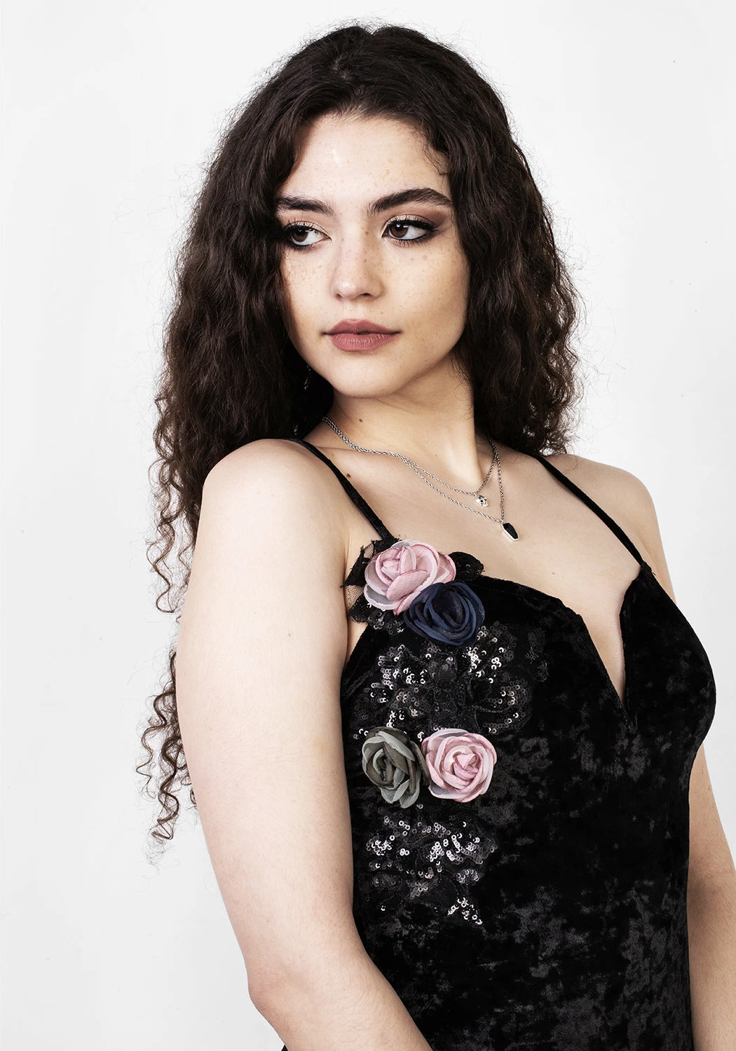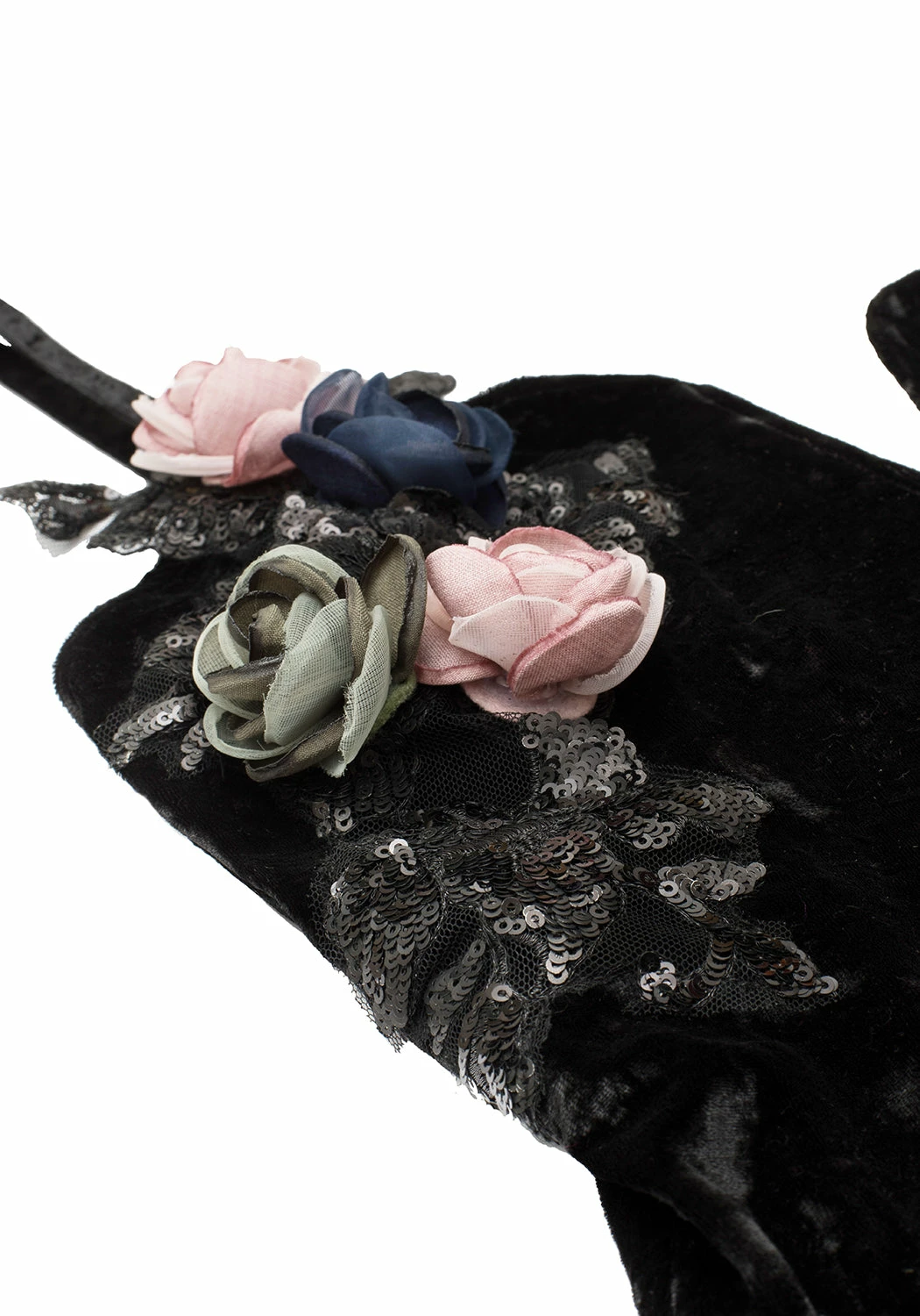 ✦ Applique roses and sequinned foliage adorn asymmetrically