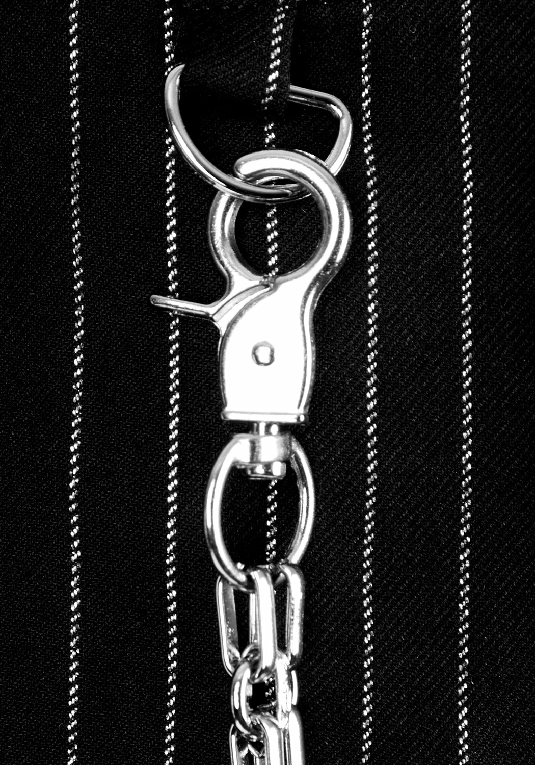 ✦ Silver hardware detail including lapel O-rings and removable statement giant safety pin chain