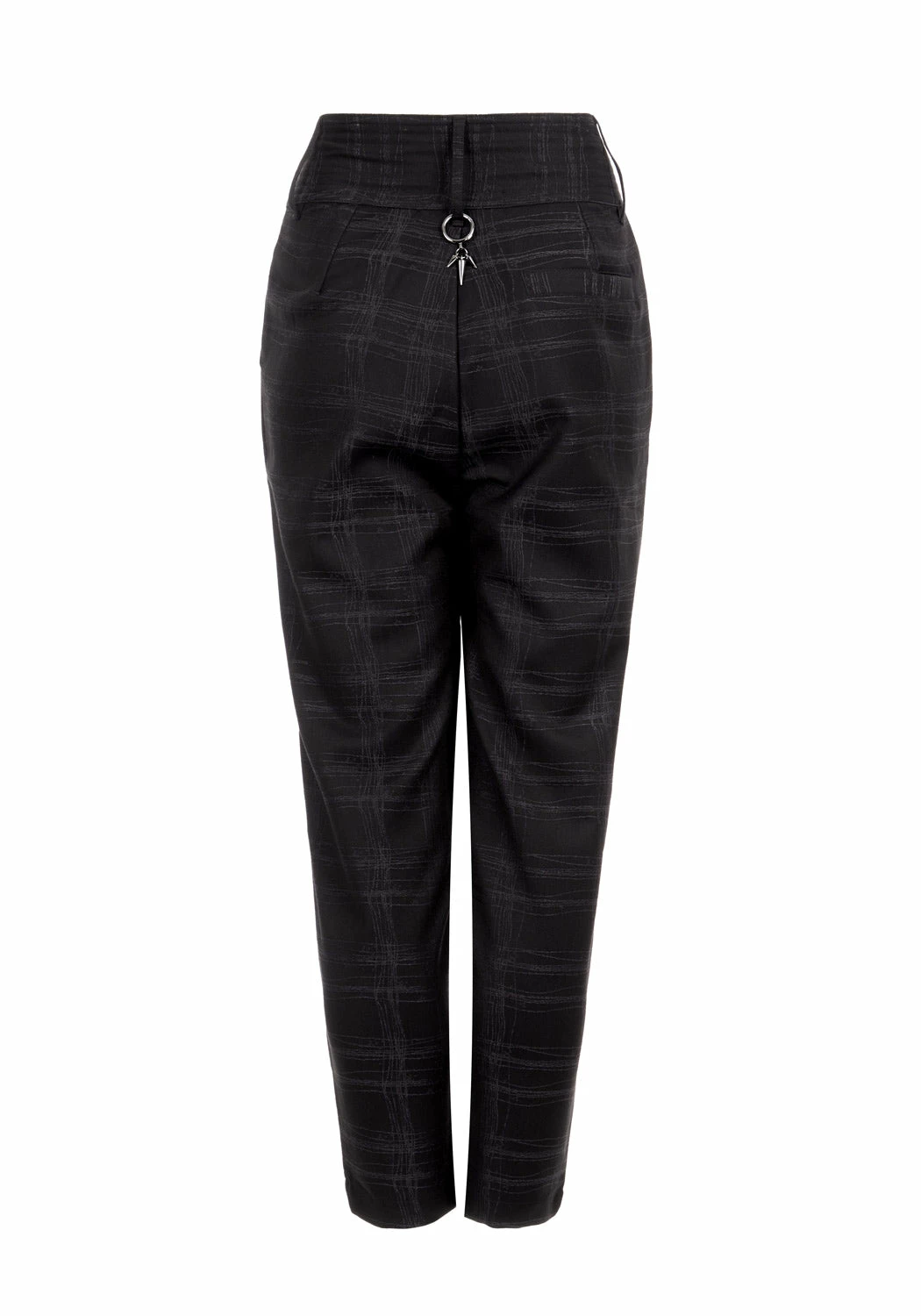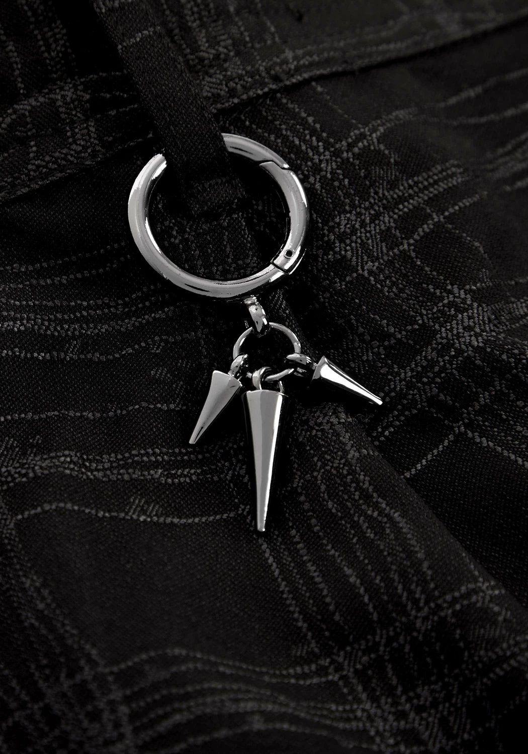 ✦ Spiked gunmetal O-ring hangs from back belt loopÂ