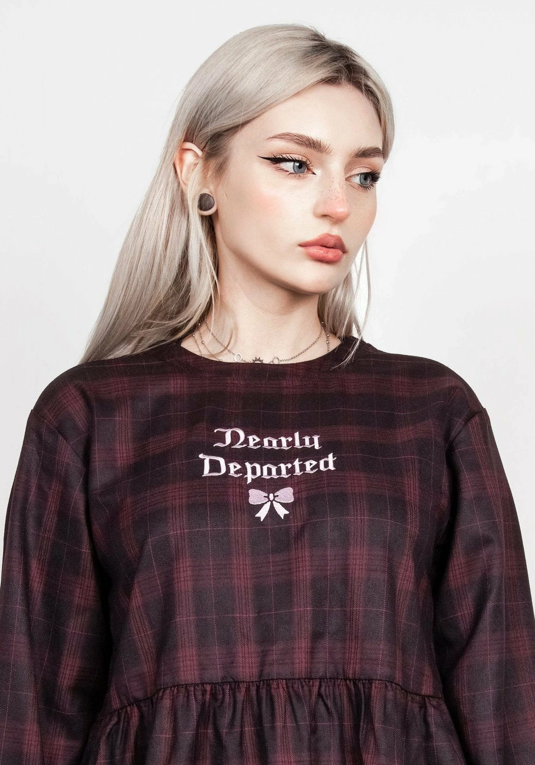 ❦ Pale pink ribbon embroidery & gothic slogan (reads ‘Nearly Departed’)