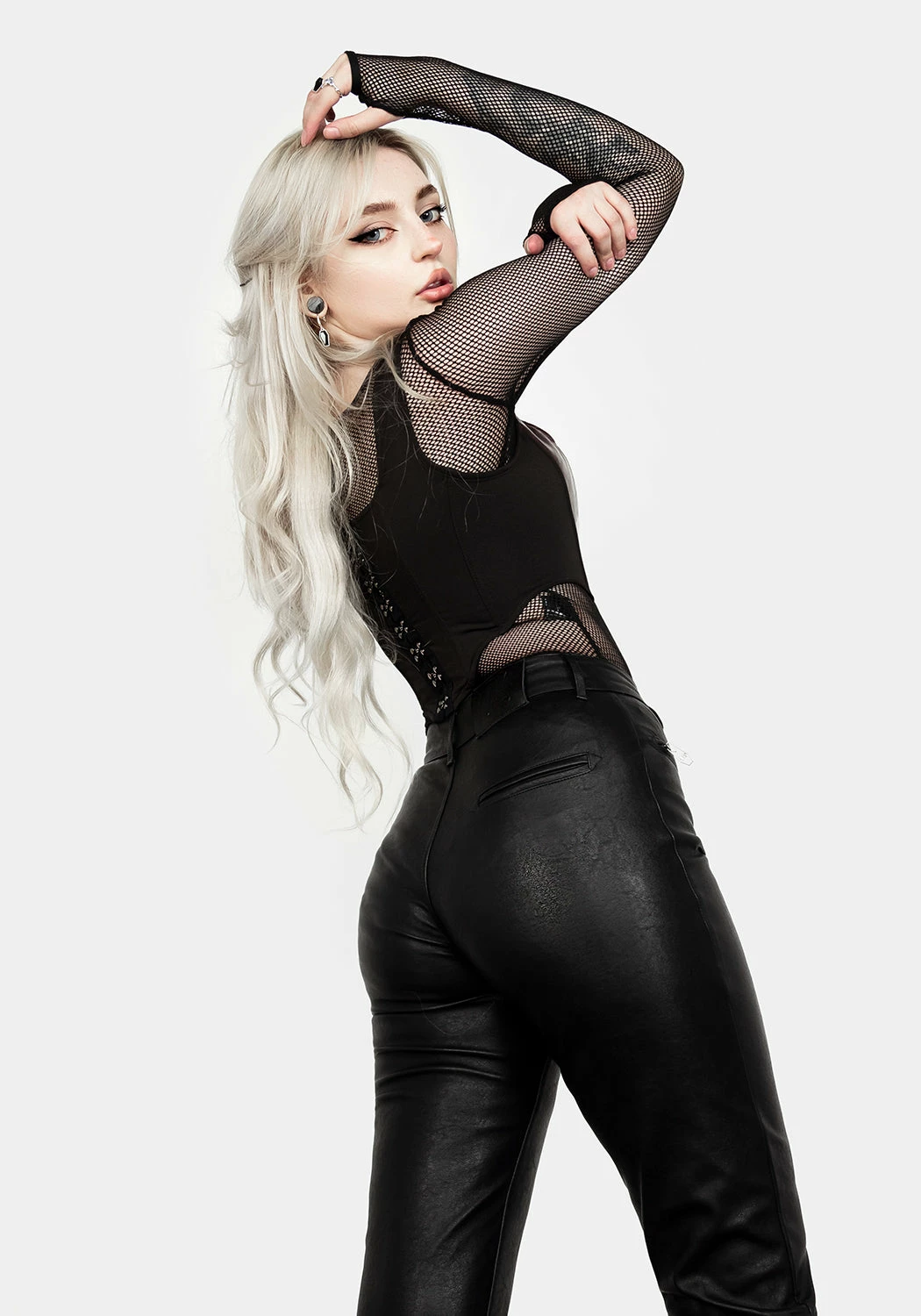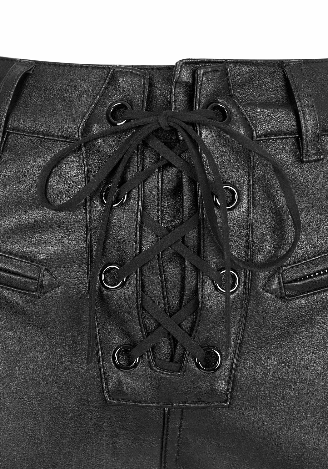 ♰ Coffin-shaped lace-up fly front with black metal eyelets & false suede lace
