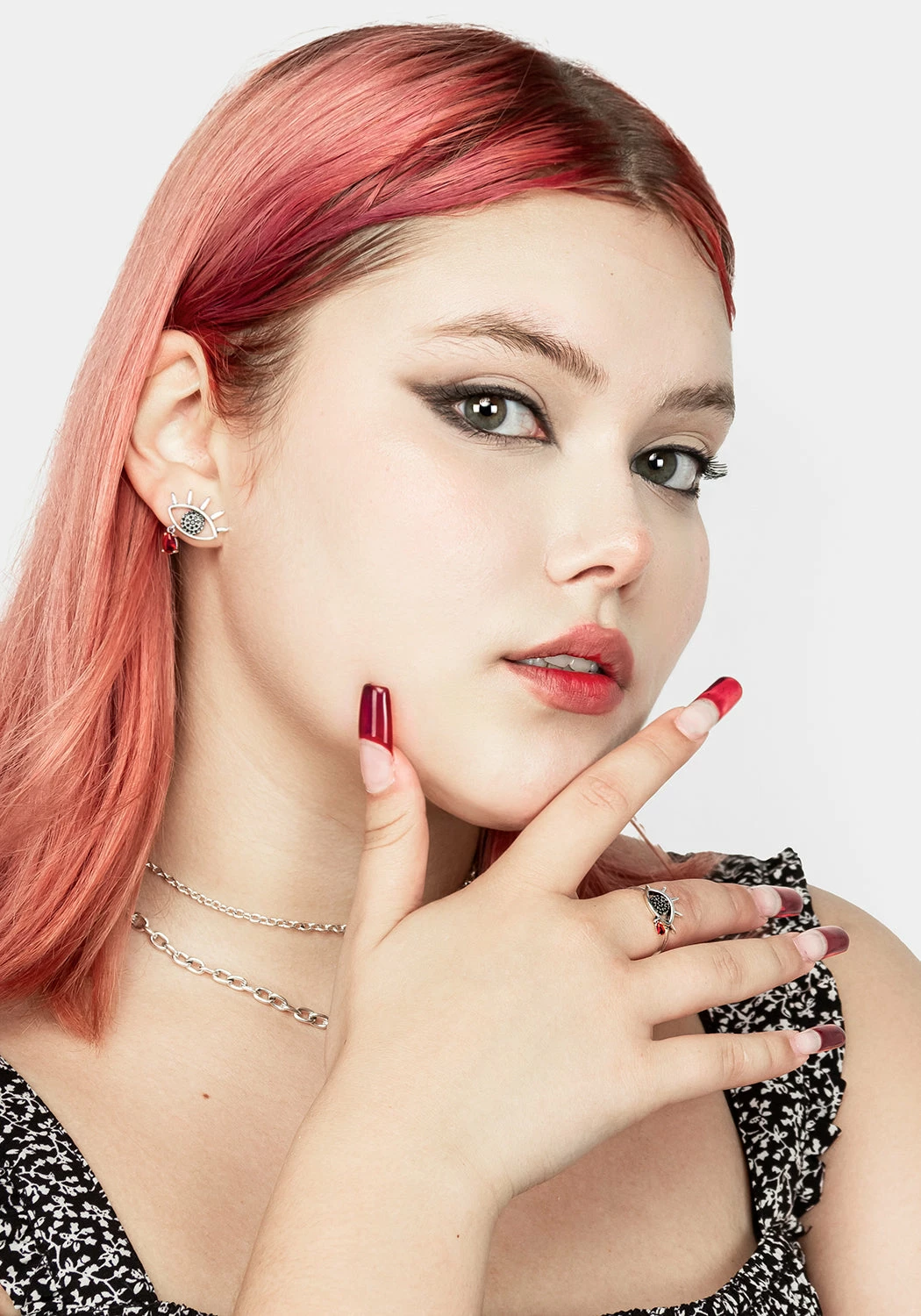 Those willing to look will spy the tiny ruby charm falling from this eye-shaped ring. The cubic zirconia teardrop symbolizes the myth of Mary, weeping blood at the state of the world. Hard relate, right? The eye’s pupil is encrusted with tiny jet black gemstones to ward off evil spirits and sits on a smooth silver-plated band. Wear with a vampish dress as a bewitching final flourish.