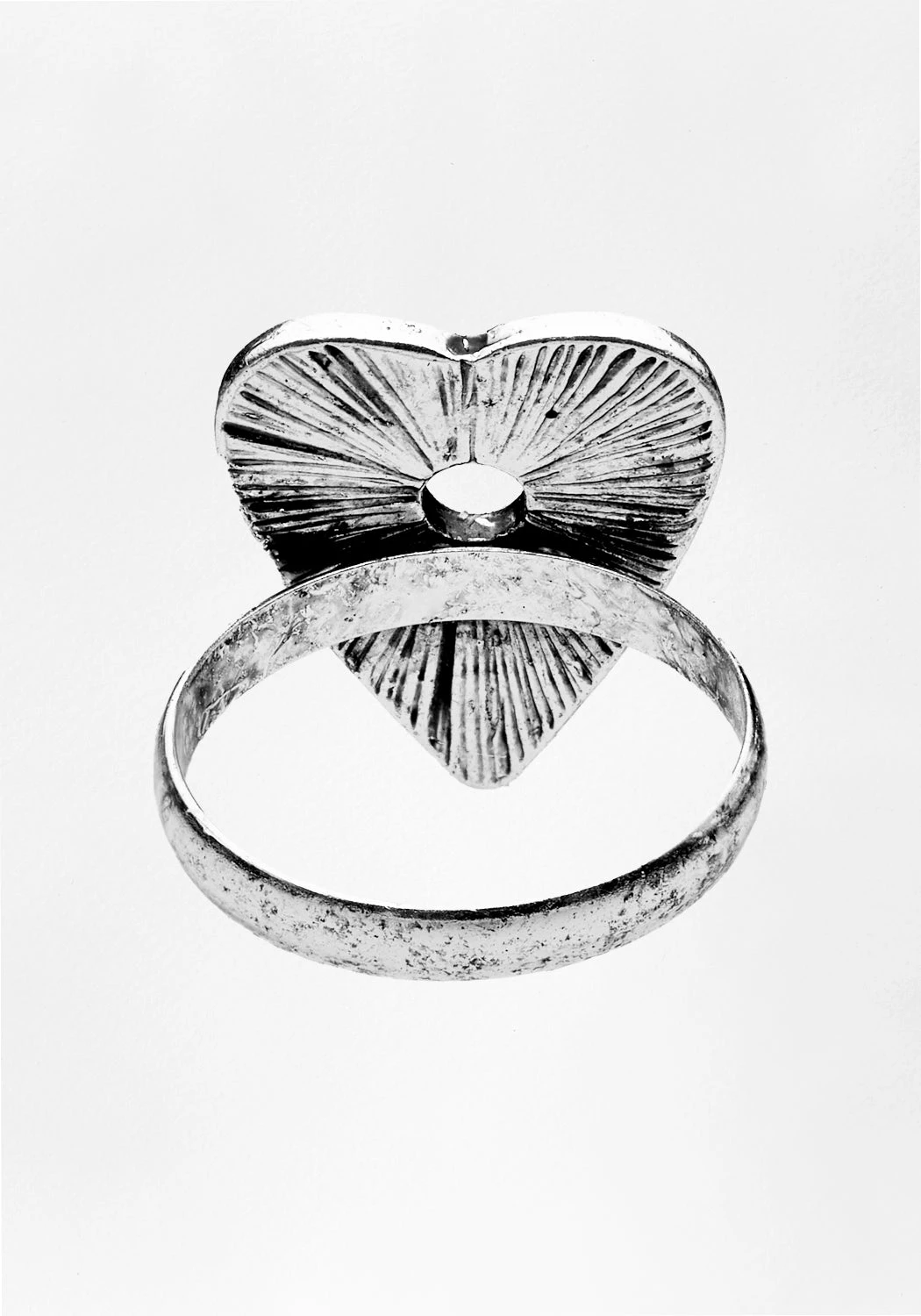 Even our cold dead hearts skip a beatย coveting this ouija planchette ring.ย The heart-shaped top is engraved with with tiny moons, stars, skull and cut-out sun detail, sitting on an antique silver band. Wear it as a macabre accent to everyday looks, or go full glam-goth for a Saturday nightย sรฉance.ย