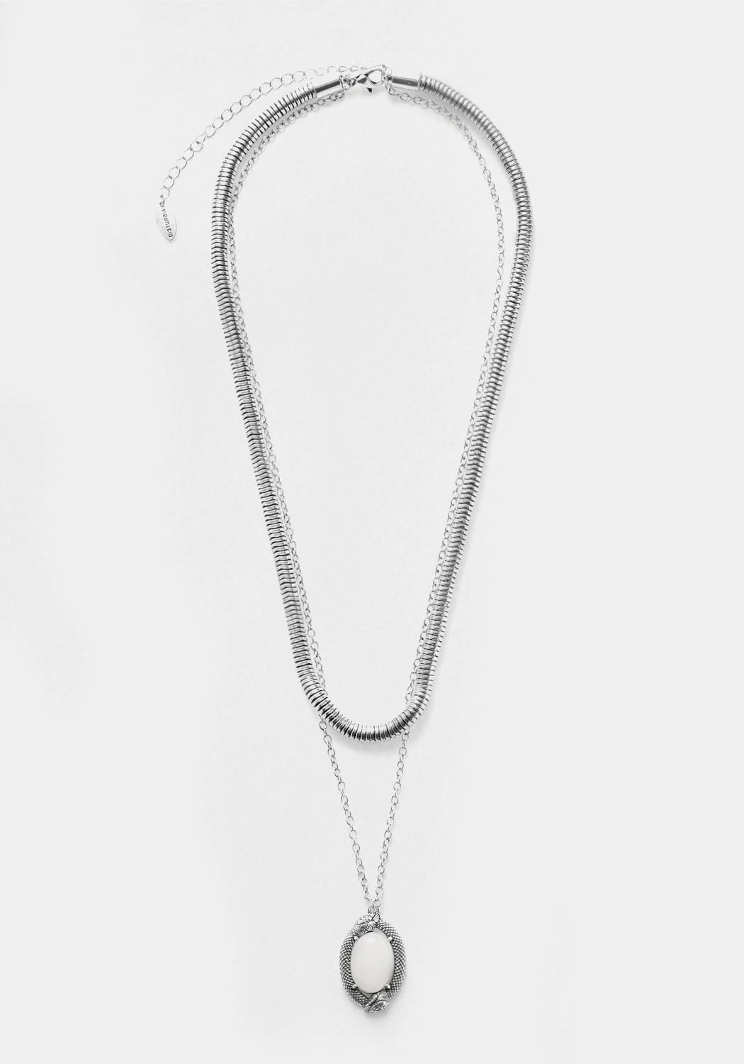 The Serpent Moonstone Multi-Chain Necklace is our take on one of the earliest and most culturally diverse mythological symbols. We’ve mounted an oval-cut moonstone onto the pendant, thought to awaken intuitive female energy and sooth emotional stresses. Two serpents wrap themselves around the milky stone, with fine scale details for a pleasingly tactile finish. It hangs from a delicate trace chain, perfectly layered with a shorter cocoon chain that snakes round the neck comfortably. This necklace is crafted with real silver plating and fastens with a lobster-claw clasp.